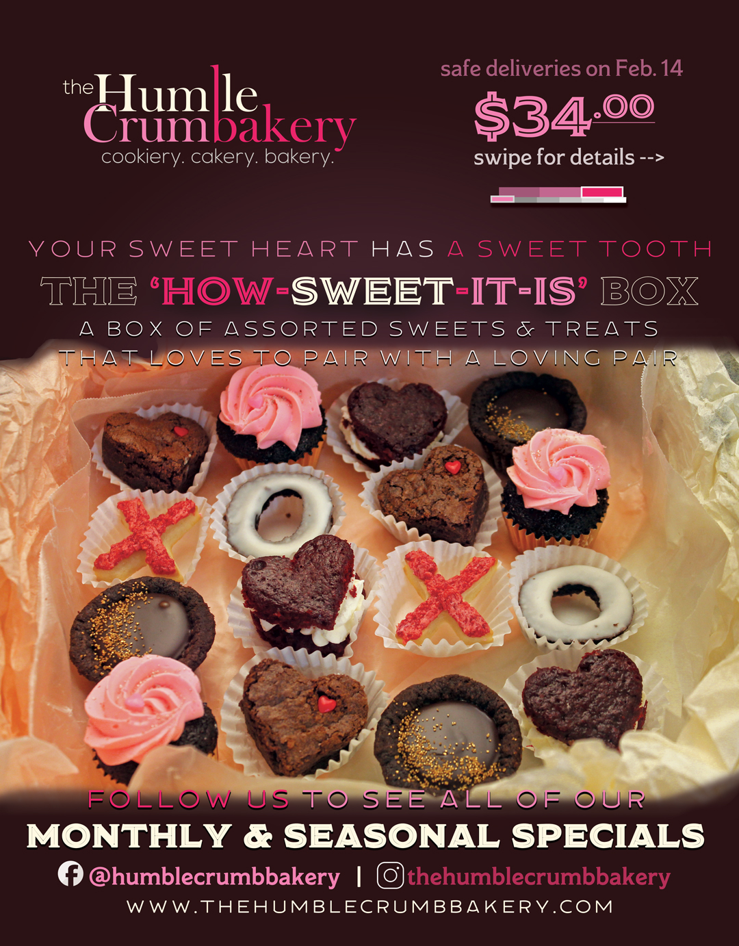 Hello! We hope you are all doing well and enjoying this chilly winter weather we’ve been having. We also wanted to let you know one of the best ways to enjoy it is with our sweet fondue Valentine’s special- 6 different kinds of mini baked goods, all tiny baked good treat versions of your favorite fondue dipping fruits- banana, strawberry, cherries, etc. We know you and your loved ones will love this fun and cozy treat this Valentine’s Day, all from the comfort of your/their home and with a sweet special price of $29 delivered. Let us know how many you’d like and where to send them and we’ll take care of the rest. Let us help you show your loved ones just how Fondue’v them you are this year with our Fondue’v You Valentine’s Box!